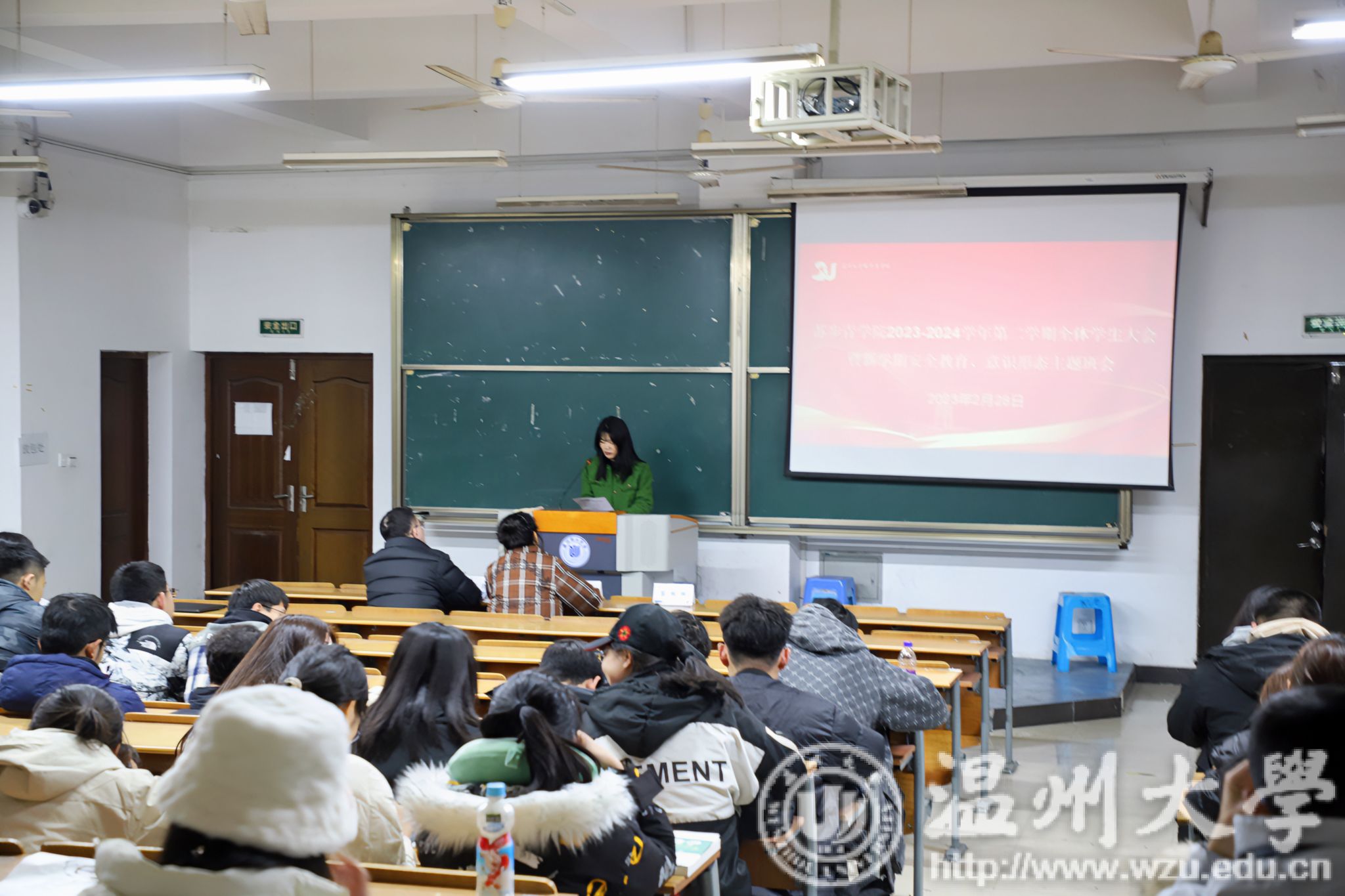 组织召开2023-2024学年第二学期全体学生大会暨新学期安全教育、意识形态主题班会。学工办主任靳颖老师、辅导员彭凯轩老师、教务科蔡维雅老师参加会议,会议由彭凯轩老师主持。