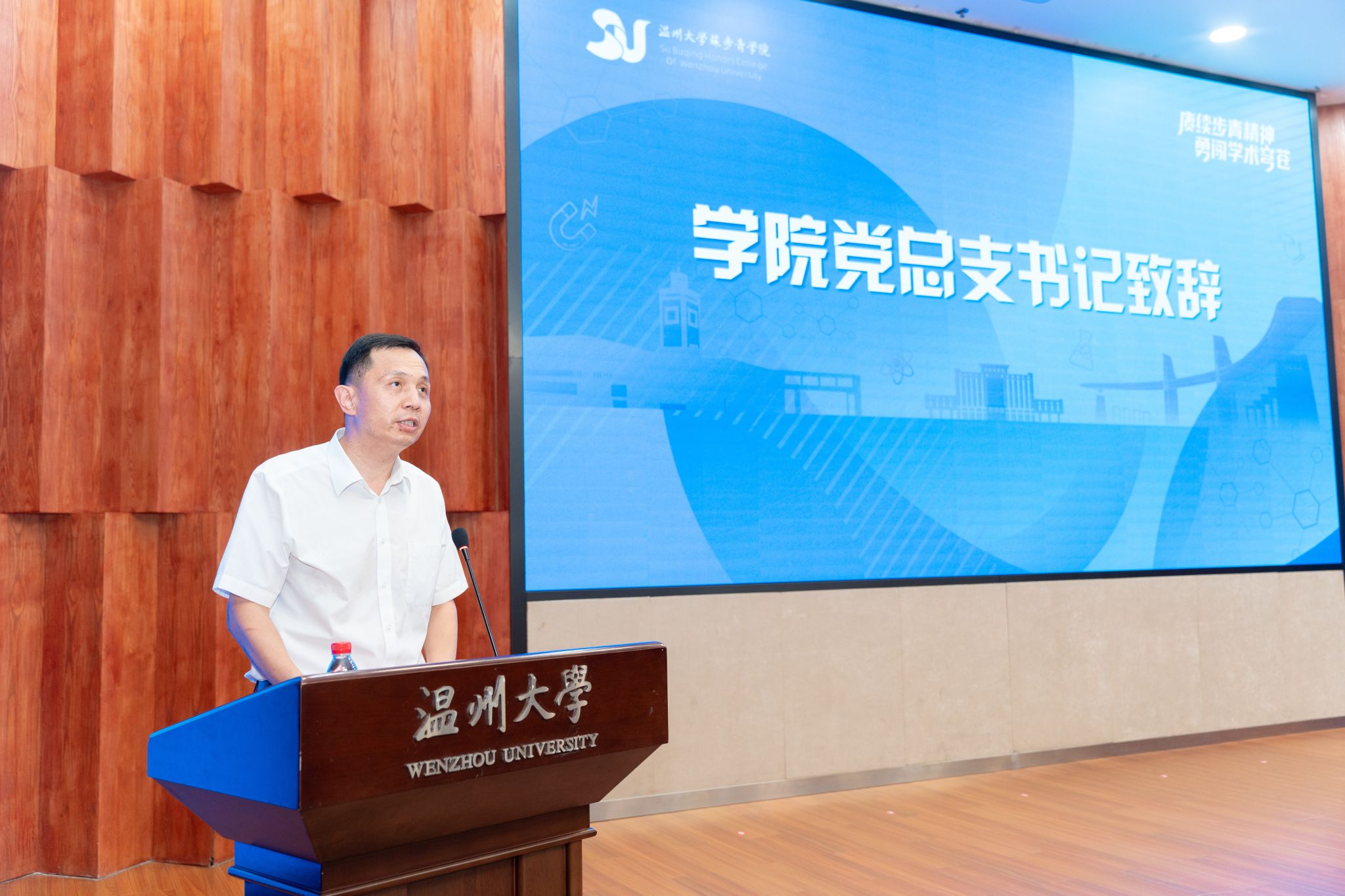紧接着,潘从义致辞。他表达了对步青学子未来学术发展的期望和祝福,并鼓励24级的同学们做深扎根的求学者,筑牢专业根基;做勇跨界的探索者,激发创新潜能;做有情怀的追梦人,心系家国天下,将个人理想融入时代潮流。同时,他勉励学生牢记荣誉学生的身份和拔尖创新人才的培养目标,以昂扬的斗志和饱满的热情迎接未来在专业学院的学习。