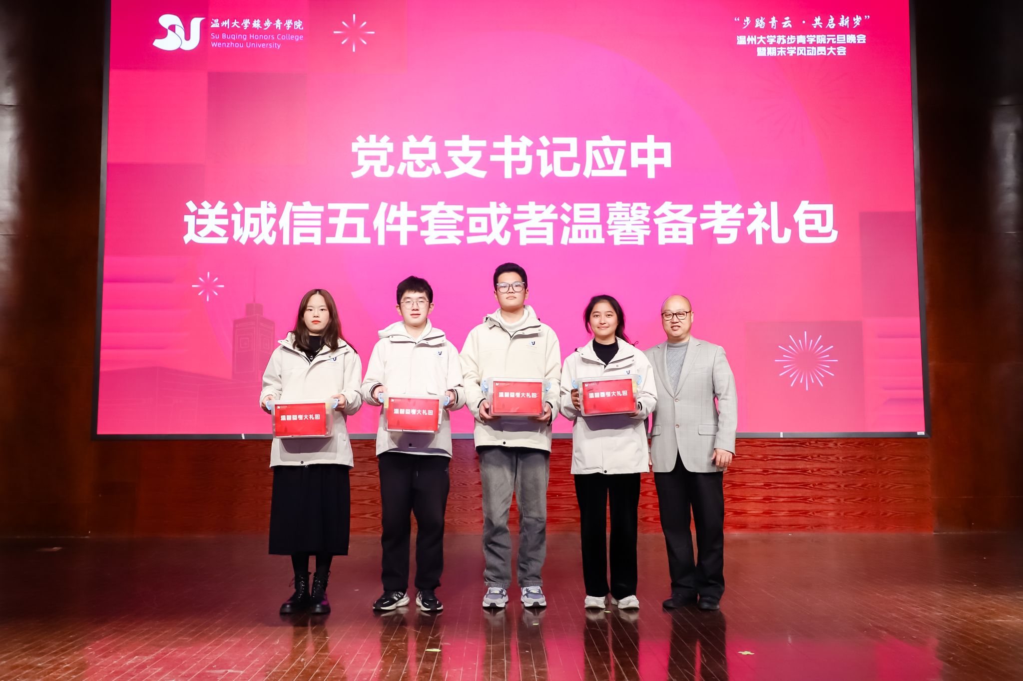 接下来是学生代表发言环节。黄星竹、周昊楠、刘维、陈杉杉四名同学分别分享了汉语言文学、数学、化学、生物学科的学习心得,表达了他们对即将到来的期末考试的信心。为了能让同学们安心备考,党总支书记应中特意为同学们送上了温馨备考大礼包,鼓励大家考出水平、考出精神、考出风采。
