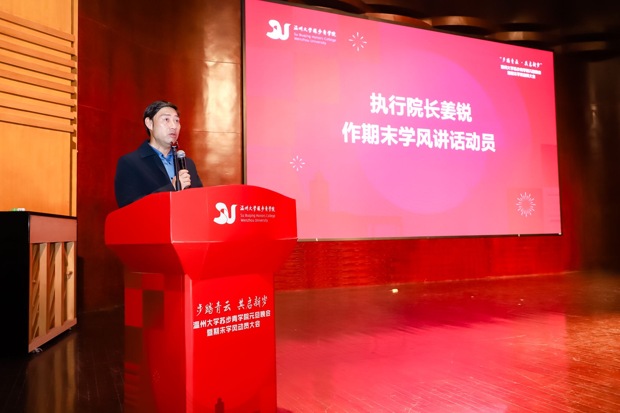 姜锐院长发表了动员讲座,他首先回顾和肯定了苏步青学子在第一学期中的辛勤努力和积极进取精神,随后指出了学习中存在的问题,并勉励同学们积极备战即将到来的期末考试。最后,姜院长还为同学们提供了备考建议和考试注意事项,指导大家进行科学高效备考。