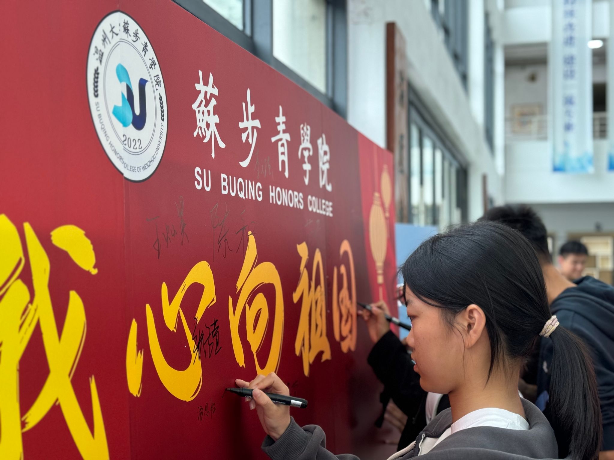 全体学生参加了主题为“我心向祖国”的签名留言活动。怀着激动的心情,同学们在签名板上郑重地签下自己的名字,纷纷上前记下自己对于祖国美好的祝愿。