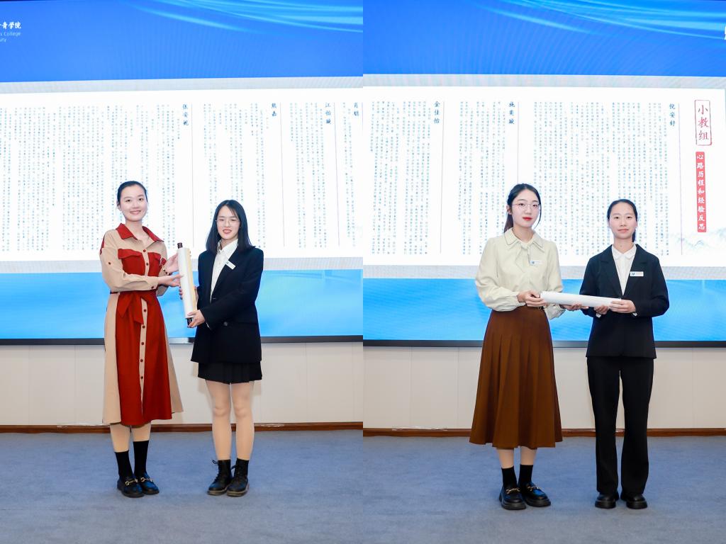 随后,典礼启动第十六届浙江省高等学校师范生教学技能竞赛颁奖仪式,获奖选手在激昂的音乐声中依次上台领奖,从老师们手中接过获奖证书和奖杯,并合影留念。