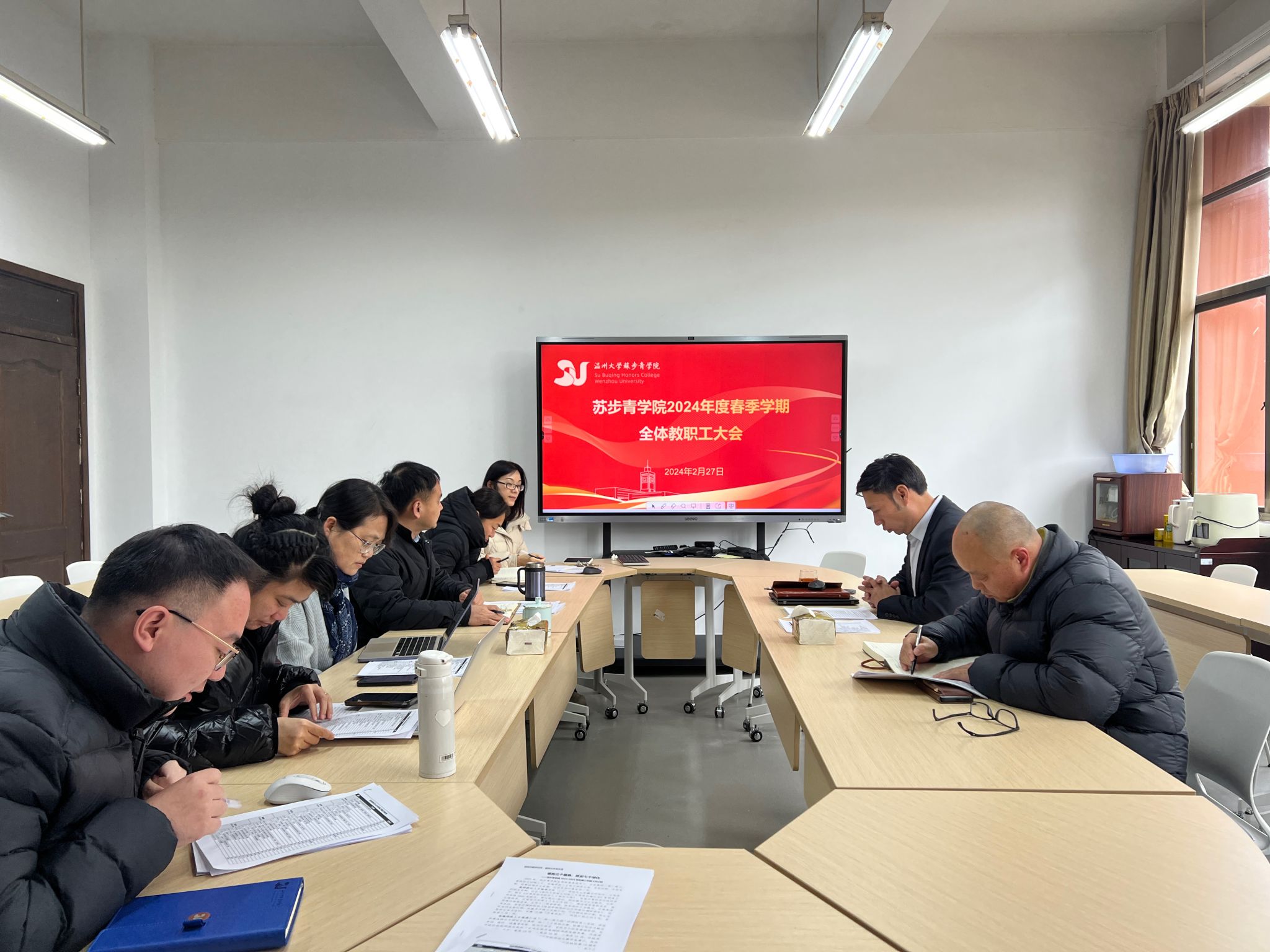 在瓯4-109党员之家召开2024年度春季学期全体教职工大会。党总支书记应中、执行院长姜锐,各科室成员参加会议,会议由姜锐主持。