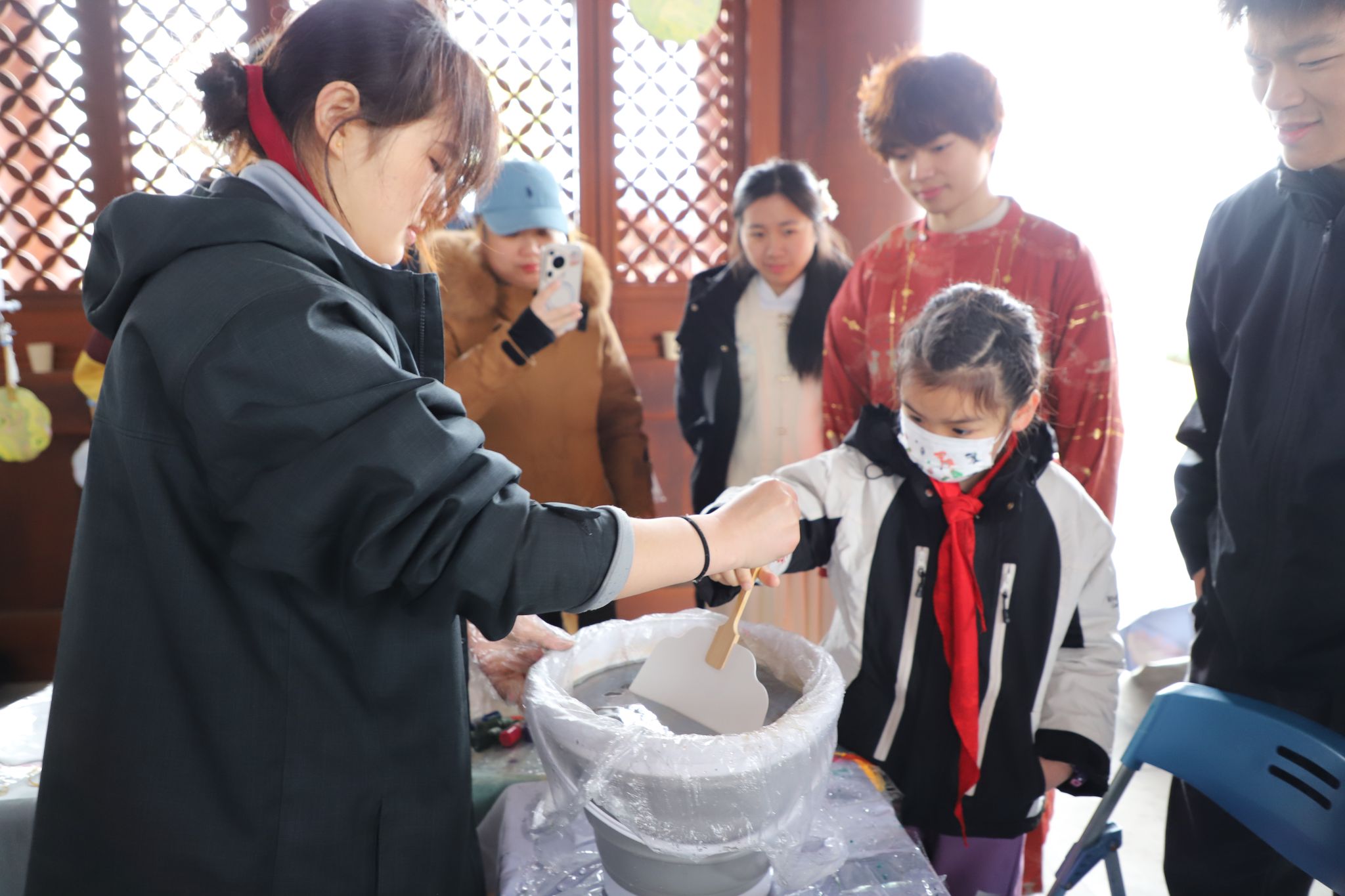 清晨,志愿者们乘船渡江抵达江心屿,细雨蒙蒙,在古韵悠长的岛屿上支起公益摊位。学生们身着汉服,飘逸的衣袂与温婉的举止瞬间吸引了孩子们的目光。在“星孩”家长们的鼓励下,许多孩子主动走近摊位,用好奇的目光探索着石膏娃娃涂鸦与漆扇活动。志愿者们以轻柔的语调引导孩子挑选颜色、尝试亲手创作,汉服的古典韵味与孩子们的纯真笑脸相映成趣,营造出跨越时空的温情画面。
