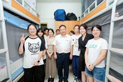 迎新当日,学校领导心系新生。赵敏校长深入学生寝室走访,细致询问新生住宿适应情况、生活需求,叮嘱大家尽快融入集体、开启充实的大学生活;庄兴忠副书记与师生亲切交谈,详细了解“学科探秘·智趣盲盒”“未来信箱”等迎新环节和新生报到情况、志愿者服务保障细节;王尧骏副校长来到学院迎新点,与新生交流并与新生合影留念,用亲切互动传递学校的温暖与期许。